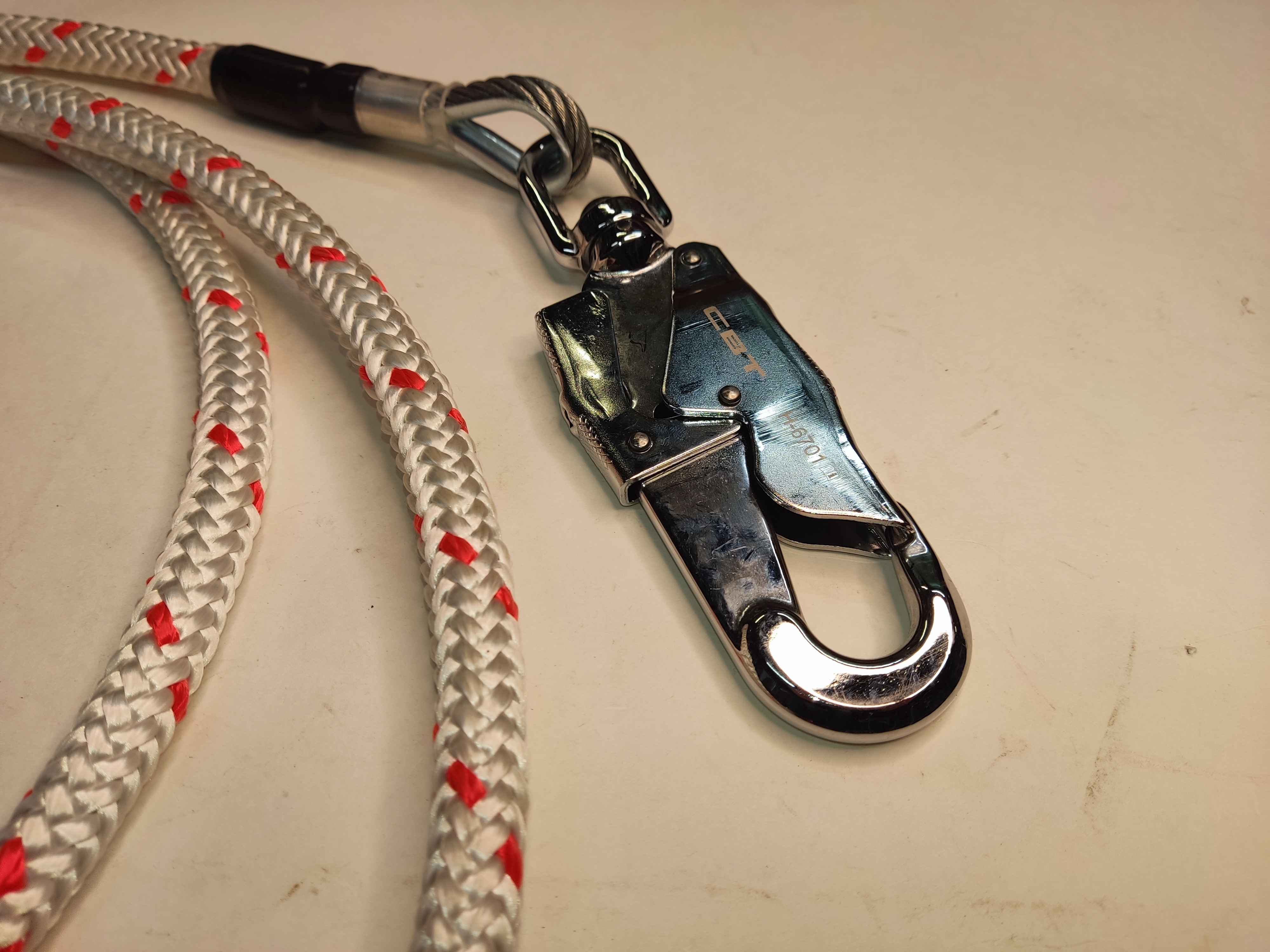 - Со стороны коуша, предусмотренного для встежки карабина опрессовка коуша покрыта прозрачным полимером для визуального контроля целостности узла и сохранения маркировки стропа в процессе длительной эксплуатации.