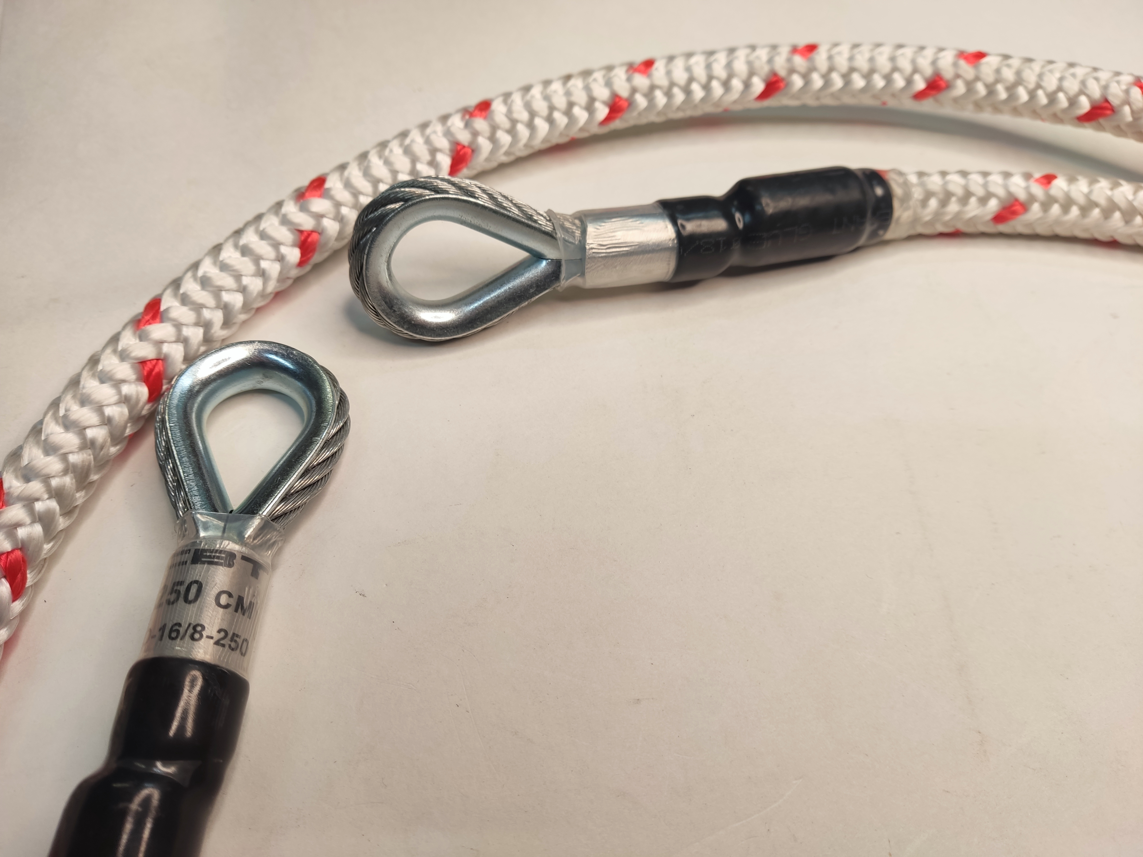 - Со стороны коуша, предусмотренного для встежки карабина опрессовка коуша покрыта прозрачным полимером для визуального контроля целостности узла и сохранения маркировки стропа в процессе длительной эксплуатации.