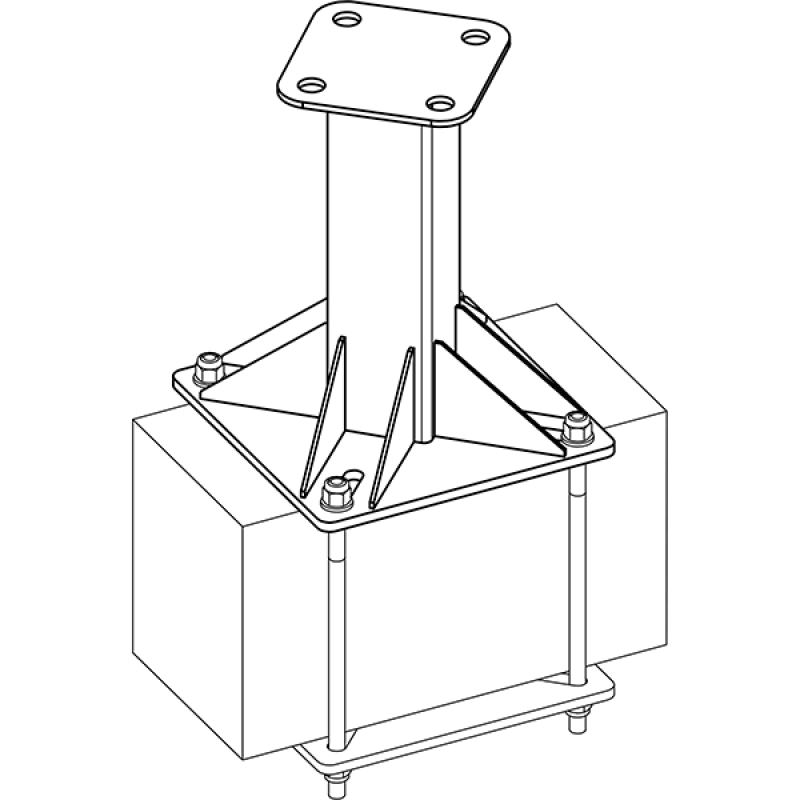 Монтируется анкерный столбик к постоянной конструкции при помощи 4-х крепёжных шпилек М12 к дополнительной крепёжной плите с пазами под анкерный пост-столбик. Комплект крепежа и крепёжная плита в комплект поставки не входят и приобретаются отдельно.