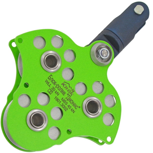 Вместо присоединительного отверстия оголовок блока «Дионис» имеет поперечный шкворень с гаечной фиксацией. Оборудован дистанционной фигурной втулкой для центровки присоединительных карабинов или петель канатов. При желании втулка заменяется на вертлюг с тем, что бы позволить подвешенному грузу вращаться.