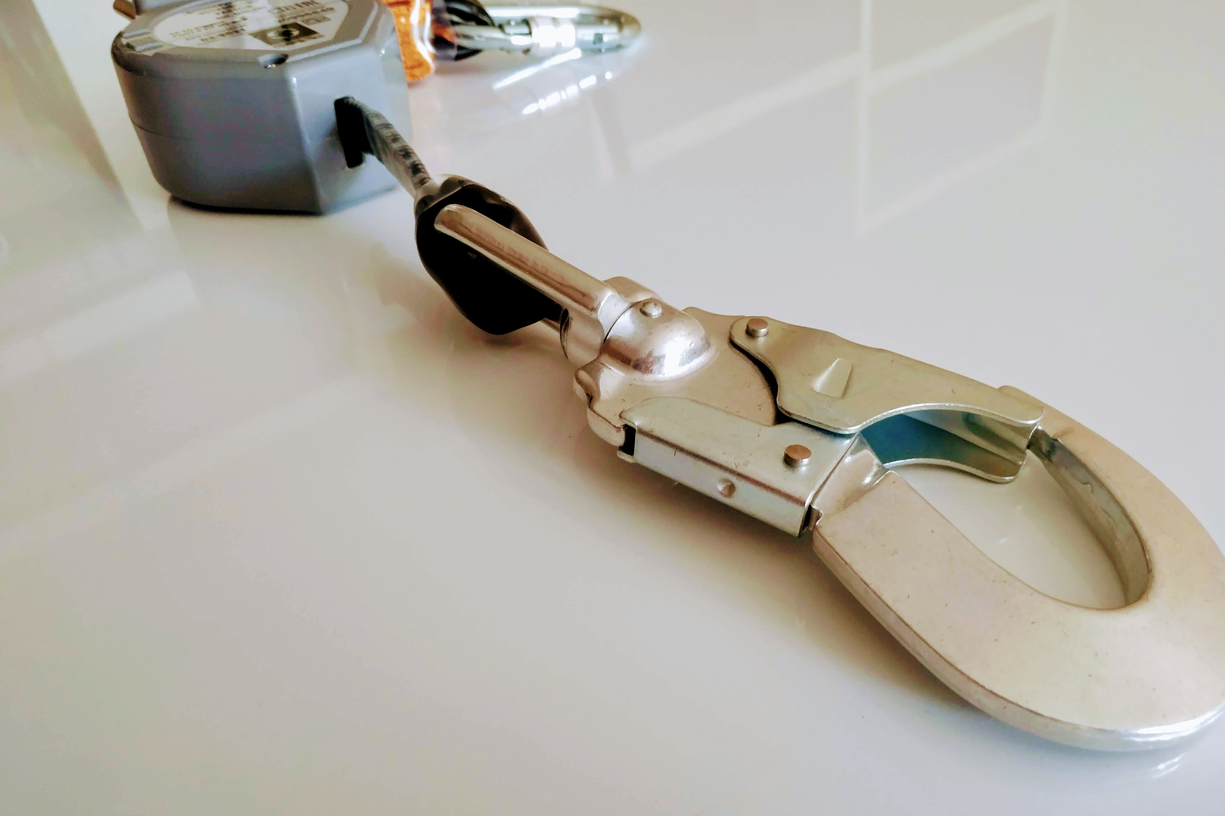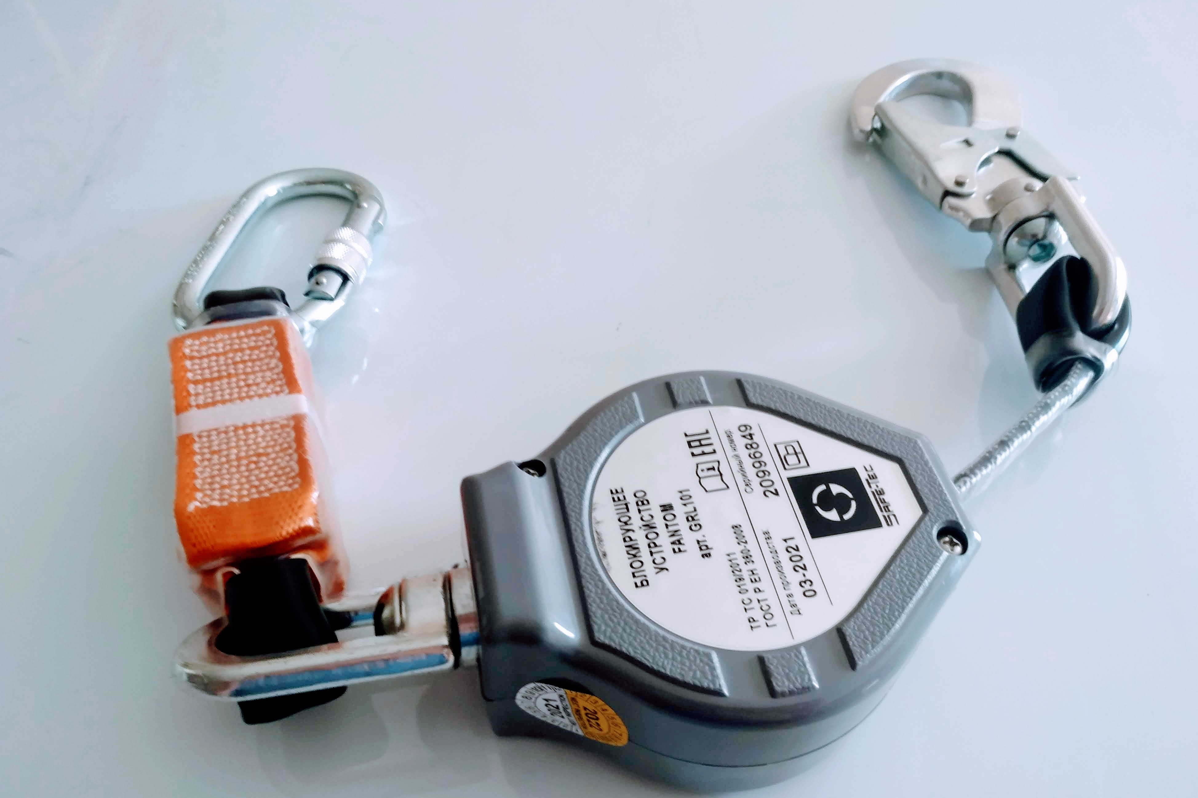 Устройство размещено в ударопрочном пластиковом корпусе и оснащено карабином AZ002AS. Ширина рабочей ленты (комбинированное плетение ПА-кевлар) 17 мм. Устройство оснащено ленточным амортизатором.