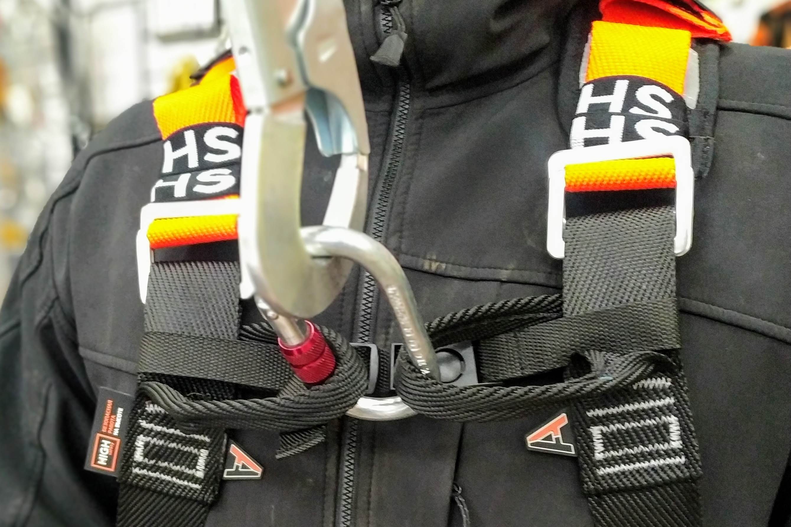 Точка прикрепления страховочно-амортизационной подсистемы на спине.