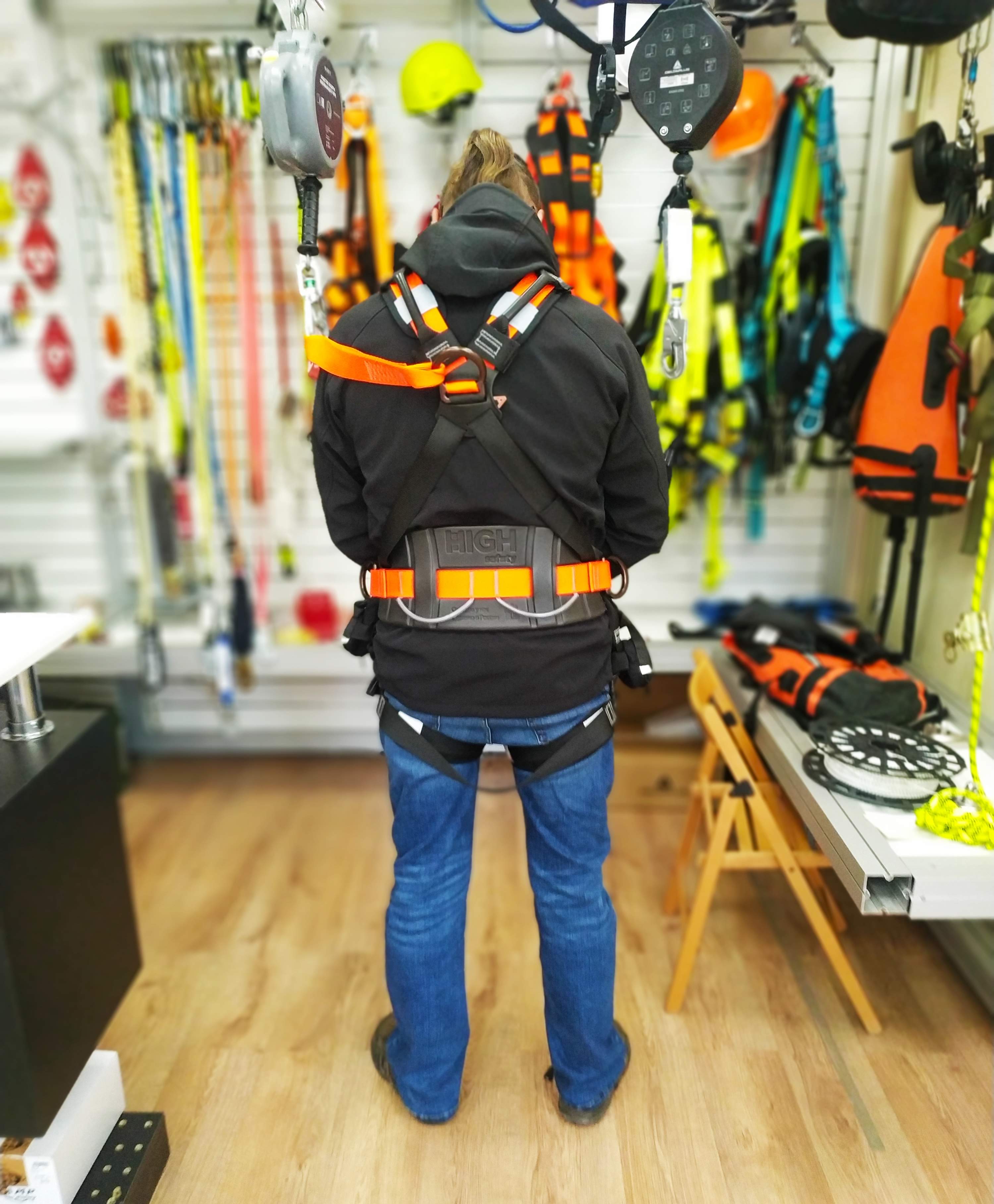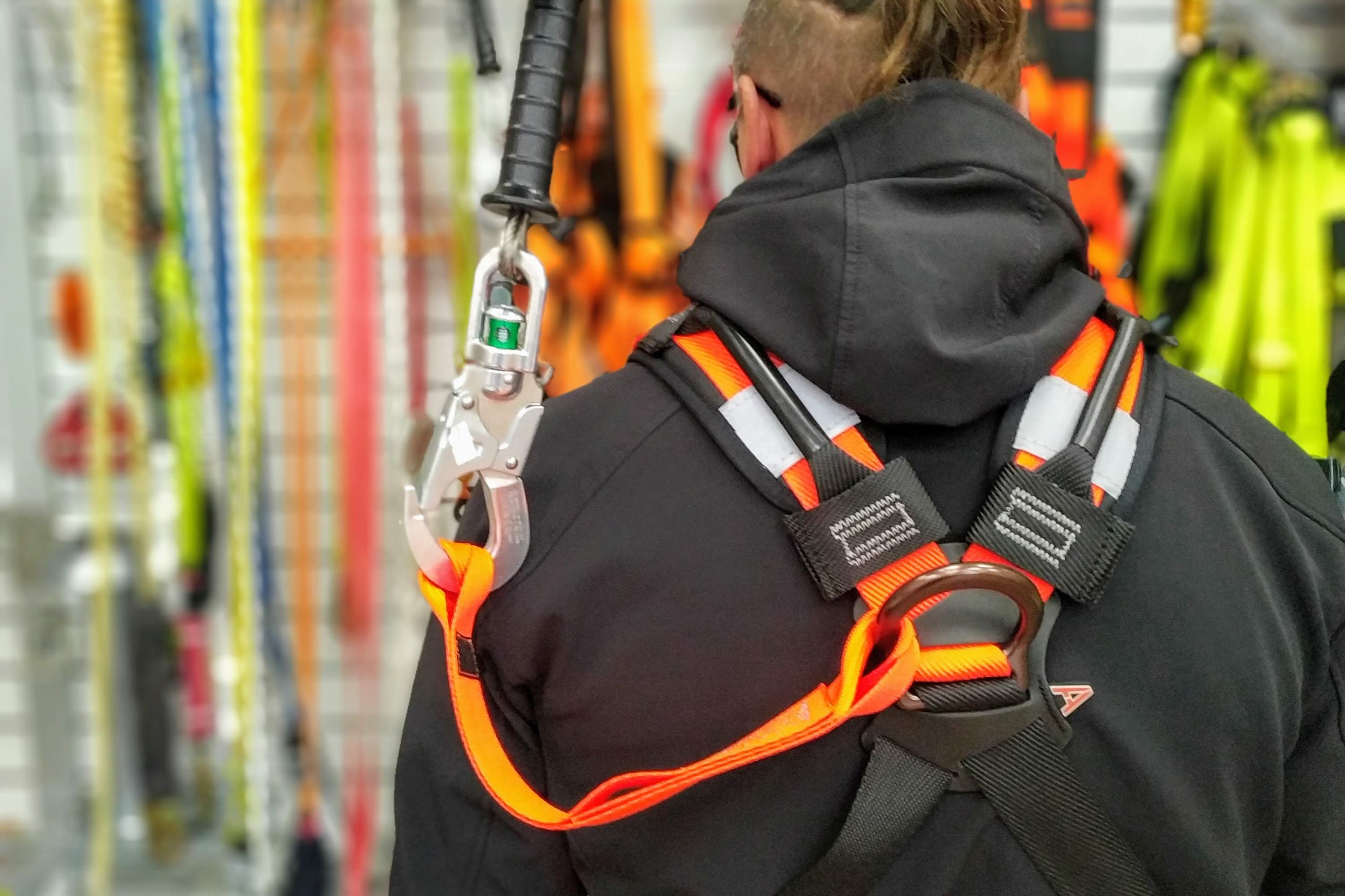 Оснащена задними элементами крепления — D-образное кольцо и удлиняющий хлястик, а также элементом крепления на груди — текстильные петли, для присоединения к системе защиты от падения. На плечевой лямке имеется застежка velcro для крепления удлиняющего хлястика. Страховочная привязь имеет формованный комфортный кушак для фиксации поясничного отдела из EVA-пены. Для рабочего позиционирования предусмотрено два D-образных кольца на кушаке. Дополнительно привязь имеет вспомогательную лямку на груди с автоматической застежкой. Кушак страховочной привязи оснащен разгрузочными петлями для крепления инструментов.