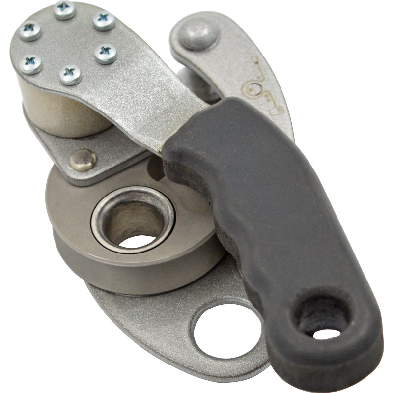 - Центральная полая ось утоплена в тело ролика-эксцентрика, что наряду с малой толщиной щеки делает отверстие для присоединения пригодным для использования, практически, с любым соединительным карабином овальной формы.