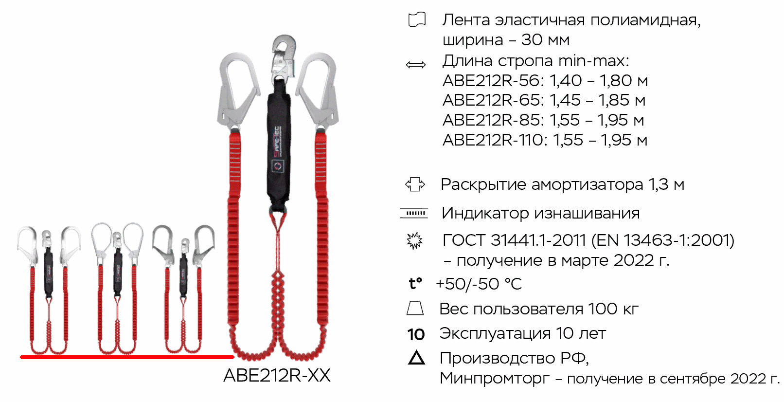 Двойной страховочный (с амортизатором) ленточный строп эластичный. Раскрытие карабинов 85 мм.
