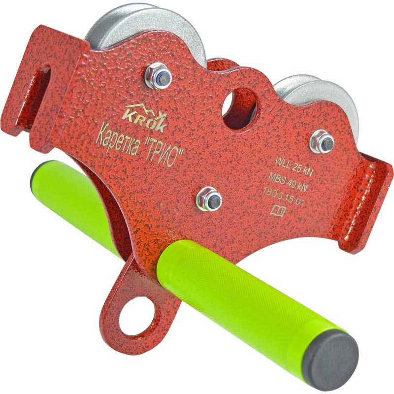 Каретка «ТРИО» — специально сконструированный стальной тандем-блок с рабочими роликами повышенного размера и специальной функцией для не снимания с рабочего троллея.
