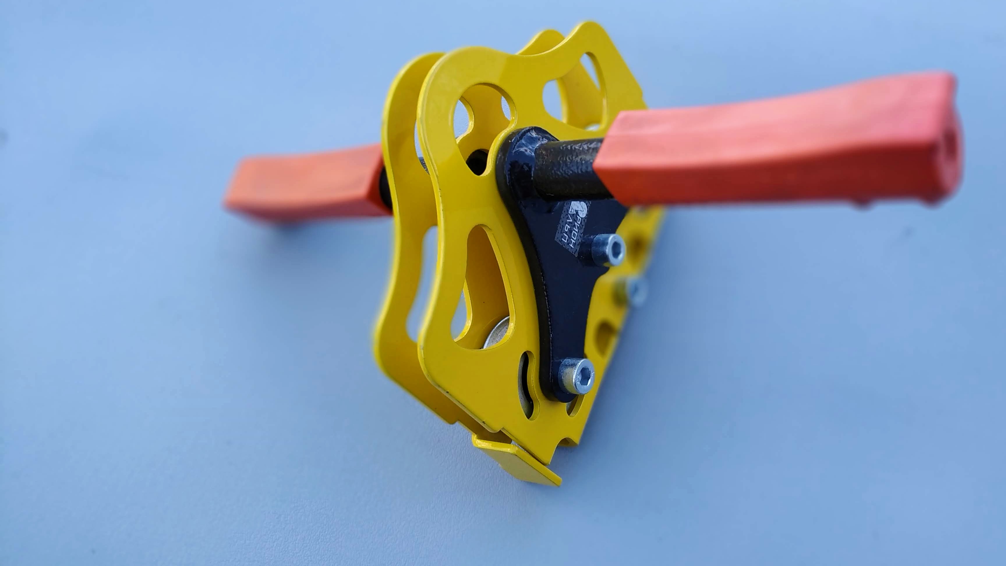 Ручки опущены существенно ниже троса и находятся ниже центра тяжести блока, что не позволяет ему переворачиваться на тросе. Также конструкция блок-ролика позволяет снимать его с троса.