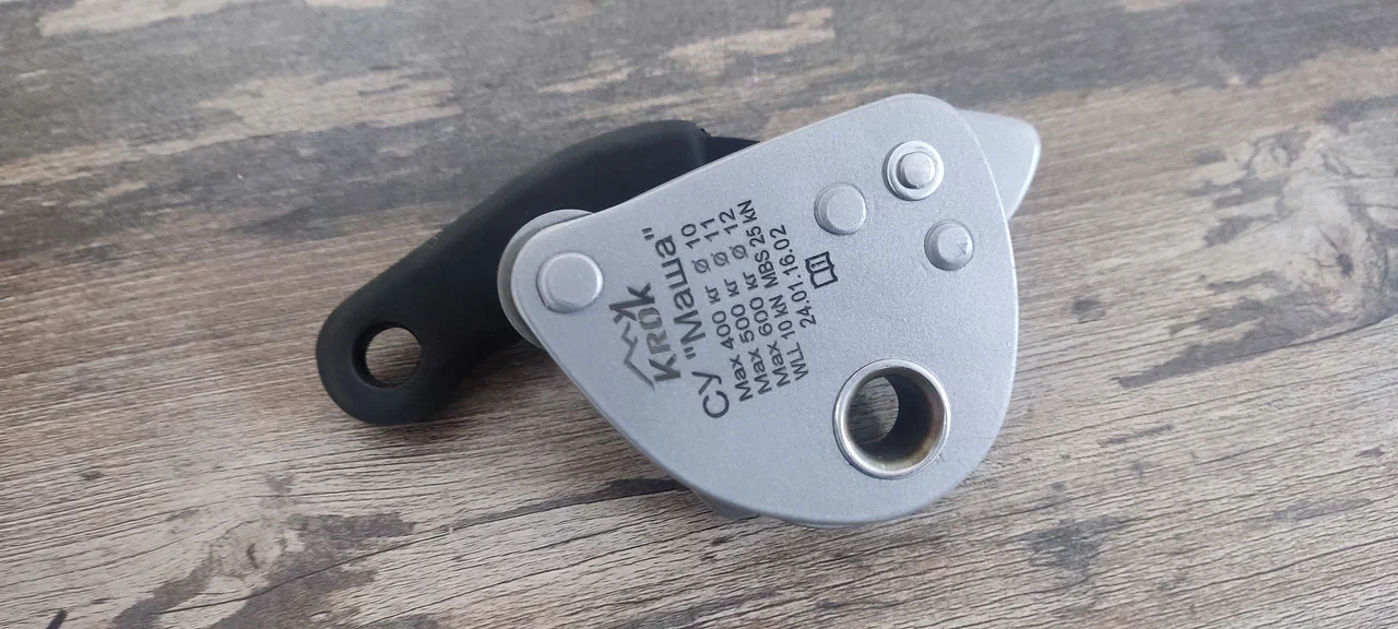 Спусковое устройство «Маша» – автоблокант для одинарной верёвки диаметром 10-11 мм с мягким управлением спуском. Устройство работает при высоте спуска не превышающей 60 метров.