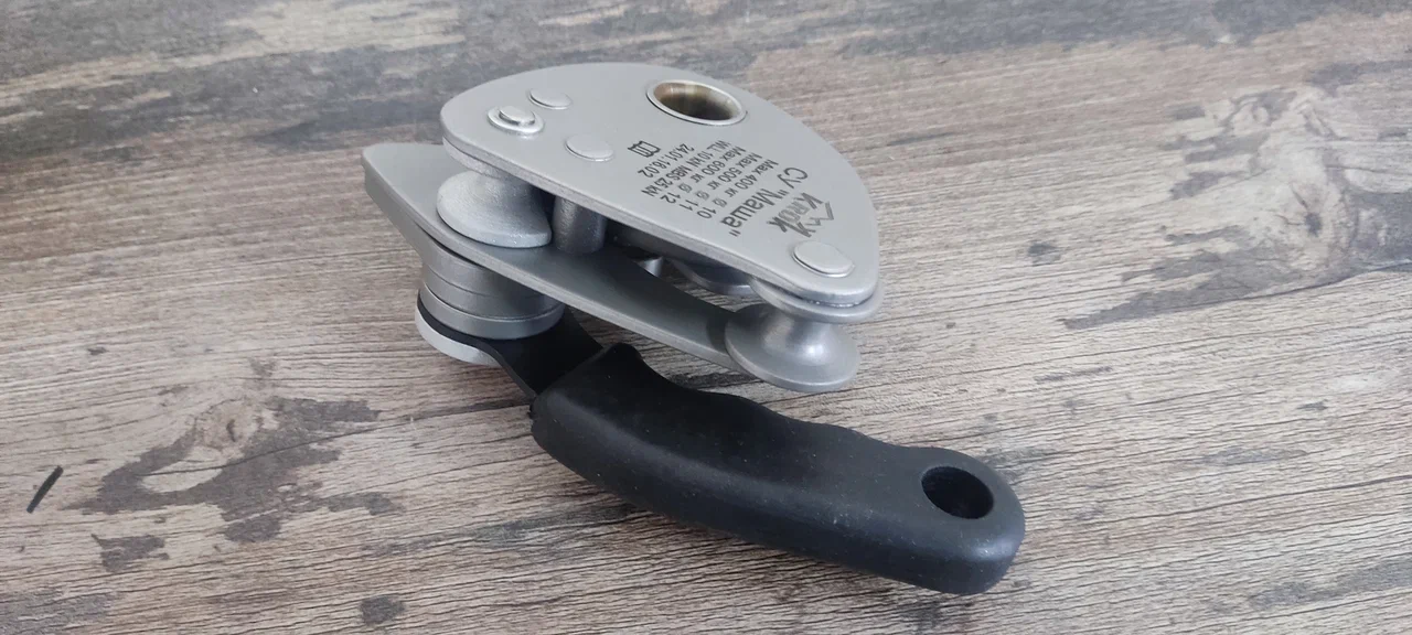 А для ограничения паразитного холостого хода (наблюдающегося обычно при самовытягивании) прижимного ролика-эксцентрика на нём установлена специальная пластина, которая упирается в соединительный карабин при провороте эксцентрика, тем самым ограничивая его. Кроме того пластина служит дополнительной щекой для рабочей верёвки.