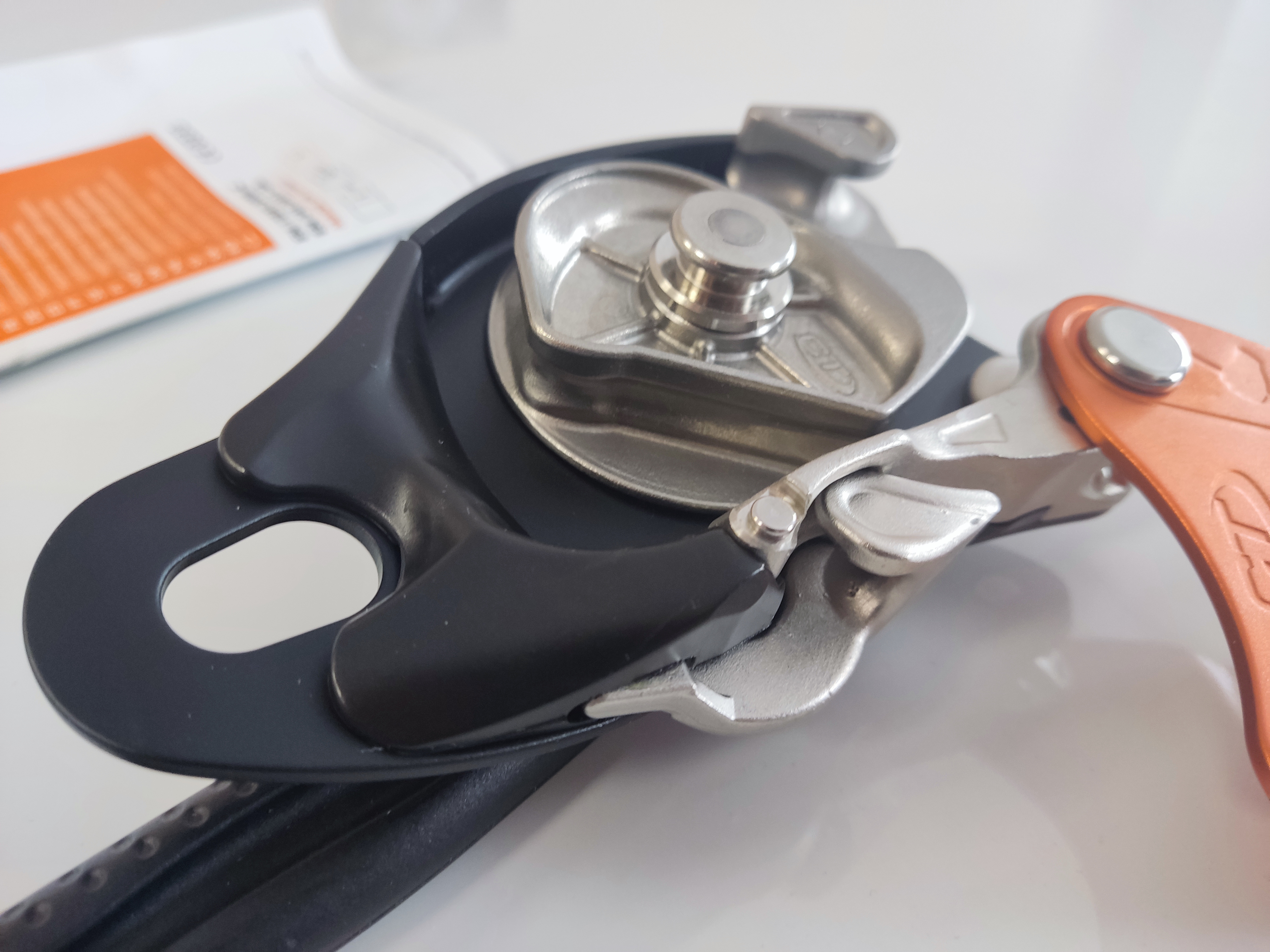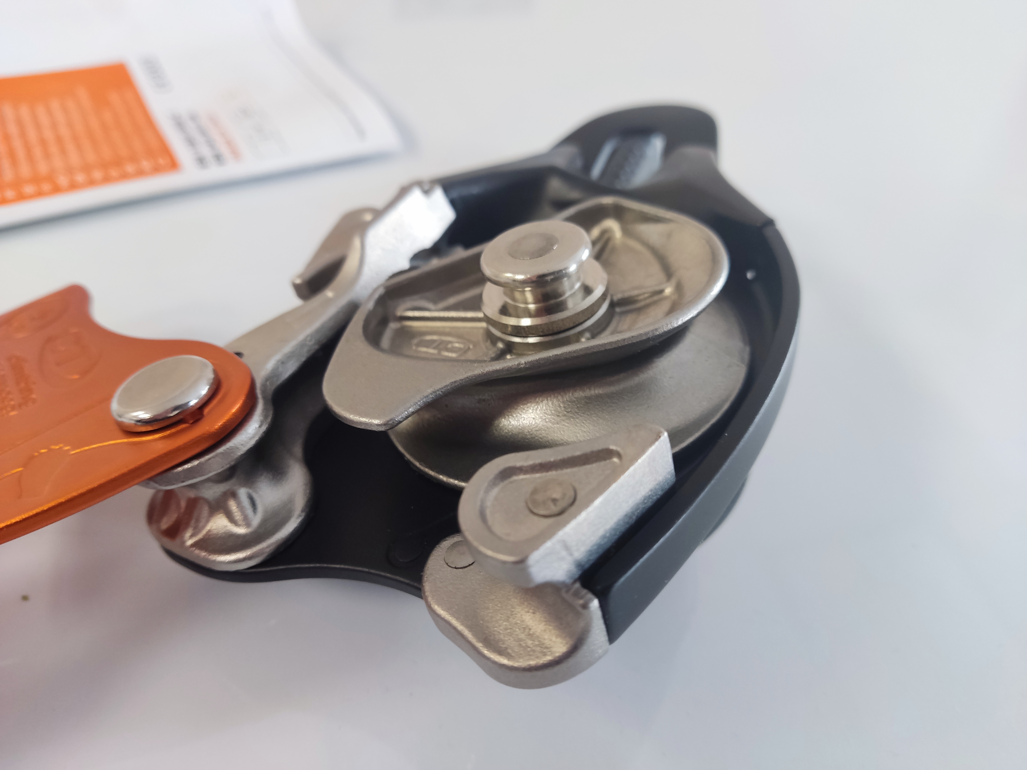- Устройство оснащено дополнительным тормозом, который создает дополнительное трение при спуске по канату без использования лишних карабинов. Форма дополнительного тормоза обеспечивает максимально эффективный контроль скорости спуска.