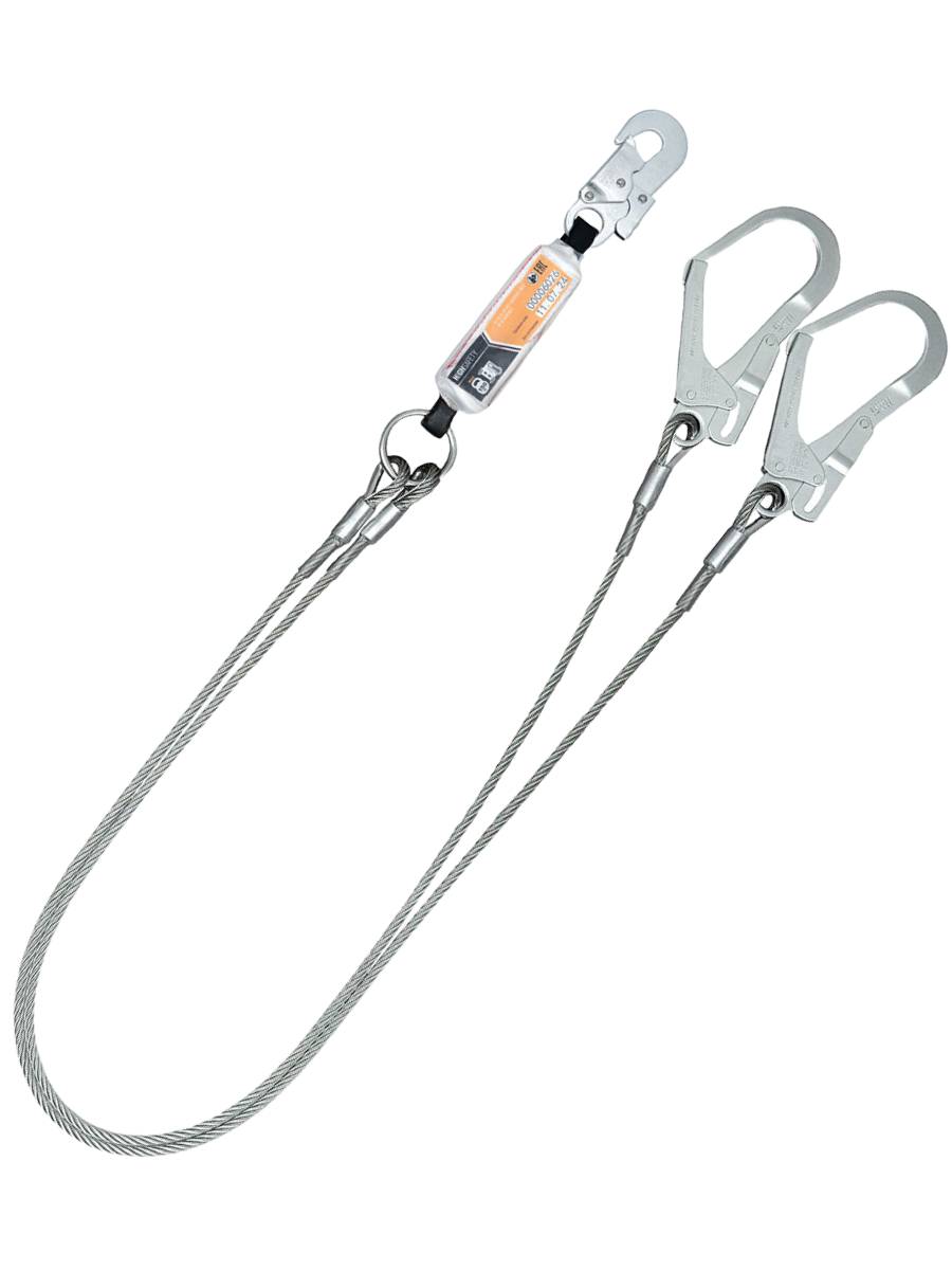 Двойной страховочный строп фиксированной длины с амортизатором с усами из стального каната. Большие карабины из стали с раскрытием 56 мм.